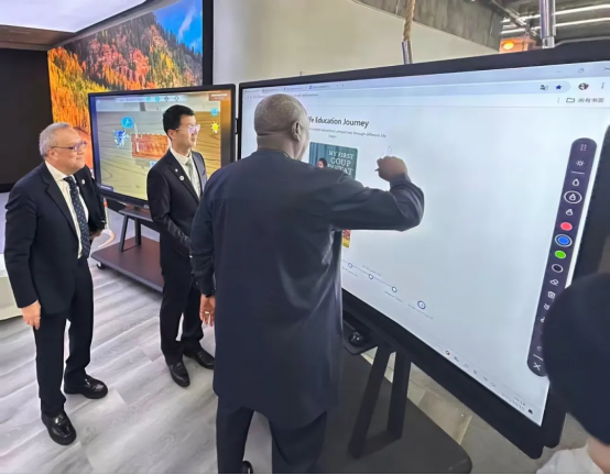 在網(wǎng)龍長(zhǎng)樂(lè)基地,馬哈馬總統(tǒng)一行首先聽(tīng)取了網(wǎng)龍?jiān)谌蛉〉玫囊幌盗袊?guó)家級(jí)合作案例的報(bào)告,并詳細(xì)了解了網(wǎng)龍AI課件、AI生產(chǎn)中心等產(chǎn)品和技術(shù)能力。網(wǎng)龍還根據(jù)馬哈馬總統(tǒng)的回憶錄,利用AI能力設(shè)計(jì)并制作了一個(gè)互動(dòng)課程,通過(guò)網(wǎng)龍普羅米休斯互動(dòng)顯示屏展示了馬哈馬總統(tǒng)與其父親關(guān)于教育的理解和評(píng)價(jià)。馬哈馬總統(tǒng)體驗(yàn)之后表示非常喜歡,并使用該互動(dòng)顯示屏的標(biāo)注功能做了簽名。